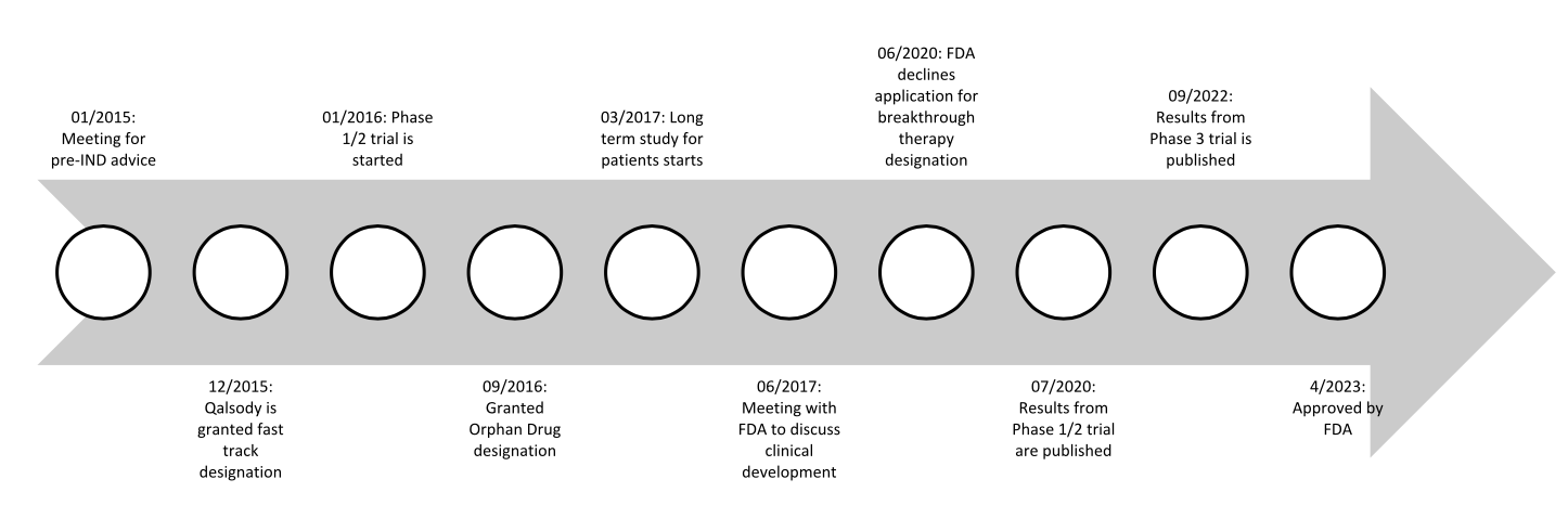 In the case of Qalsody, this pre-IND meeting was used to discuss what non-clinical studies of toxicology could be used to lead to the IND approval. In November of the same year, an IND was granted. In December, Qalsody was granted fast track designation.
