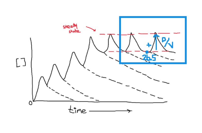 It’s the same idea as the estimation of your loading dose peak, except now you’re not starting from scratch. You’re starting from your steady state trough level.