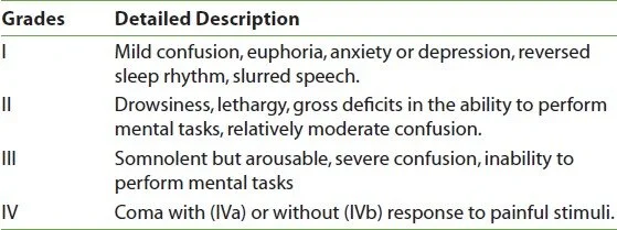 This is pretty much what the name sounds like - altered mental status secondary to hepatic insufficiency. It’s estimated that 30-45% of patients with cirrhosis develop HE. It can have a significant impact on healthcare utilization (an estimated $1-7 billion/year due to hospitalizations) and quality of life for patients. HE exists on a spectrum of symptoms, and severity is graded according to the below system: