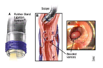Once found, non-pharmacologic or endoscopic control of a bleeding varix can include sclerotherapy (injecting a substance to make the vessel collapse, which is no longer favored) and EVL, or endoscopic variceal ligation. EVL is otherwise known as “banding” or placing a rubber band around the bleeding vessel.
