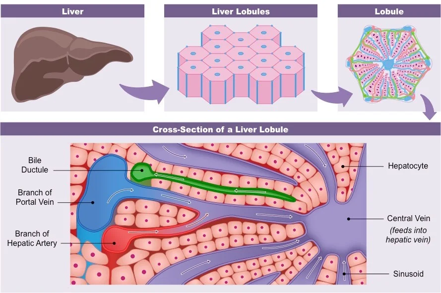 Each lobule consists of hepatocytes (cells) and a circulatory system that allows for material exchange (UBER important to pharmacists because “materials” = DRUGS). This circulatory system includes blood flow into the lobule sinusoids via the hepatic artery (provides oxygen to the hepatocytes) and via the portal vein (brings all the nutrient goodies from the GI system).