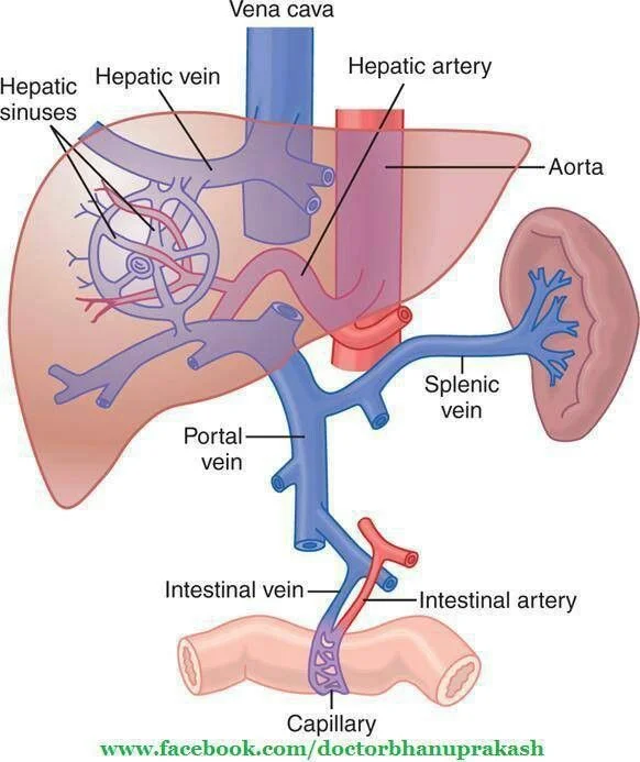 Hepatic blood flow. Note how there are 2 sources of blood going TO the liver: the hepatic artery bringing oxygenated blood to the hepatocytes and the portal vein bringing nutrient (or drug)-rich blood from the GI tract. (Image)