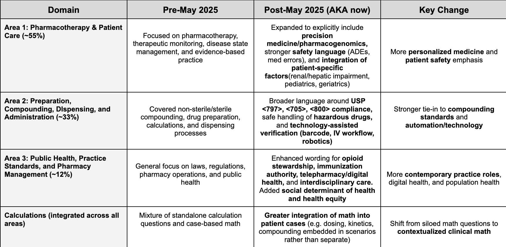 I am not going to dive super deep into this because it can be found in the bulletin linked above. But I did want to touch base on the most recent NAPLEX updates. As of May, 2025, the NABP revised and reorganized the competency statements to better align with current pharmacy practice. The structure and length of the exam did not change but the blueprint was updated. What exactly does this mean for us test takers?