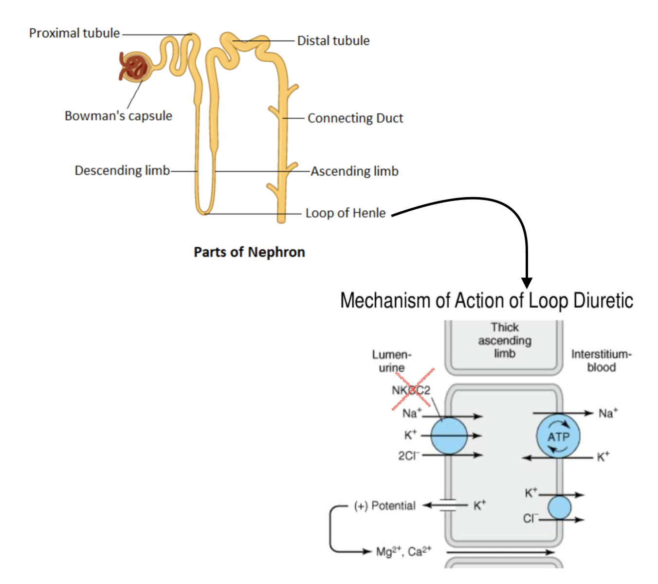 Specifically, we tend to see loop diuretics. They are the first line of treatment for congestion in heart failure patients. Loop diuretics work when the kidney is filtering the blood and is sorting out how much water and salt to keep. If we look at the nephrons that are inside the kidney, loop diuretics act at the Loop of Henle.