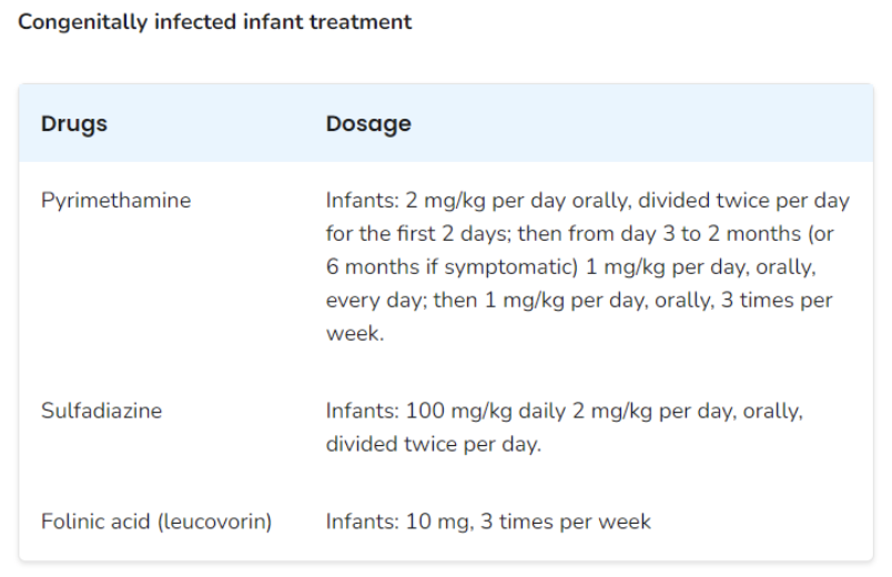 Congenitally infected newborns are also treated with a combination of pyrimethamine, sulfadiazine, and leucovorin for at least 12 months. The dosing recommendations can be found in the table below: