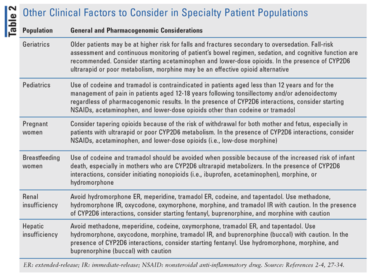 Pharmacogenomics-guided opioid therapy enables clinicians to determine the best options for avoiding treatment failure and serious side effects. However, clinicians should continue to personalize pain management by considering other factors as well. For example, elderly patients are at higher risk for falls and fractures secondary to oversedation. Therefore, opioid therapy in elderly patients should be initiated and titrated with caution, and patients should be monitored more frequently for constipation, cognitive dysfunction, sedation, and fall risk. Check out the table below for additional special considerations: