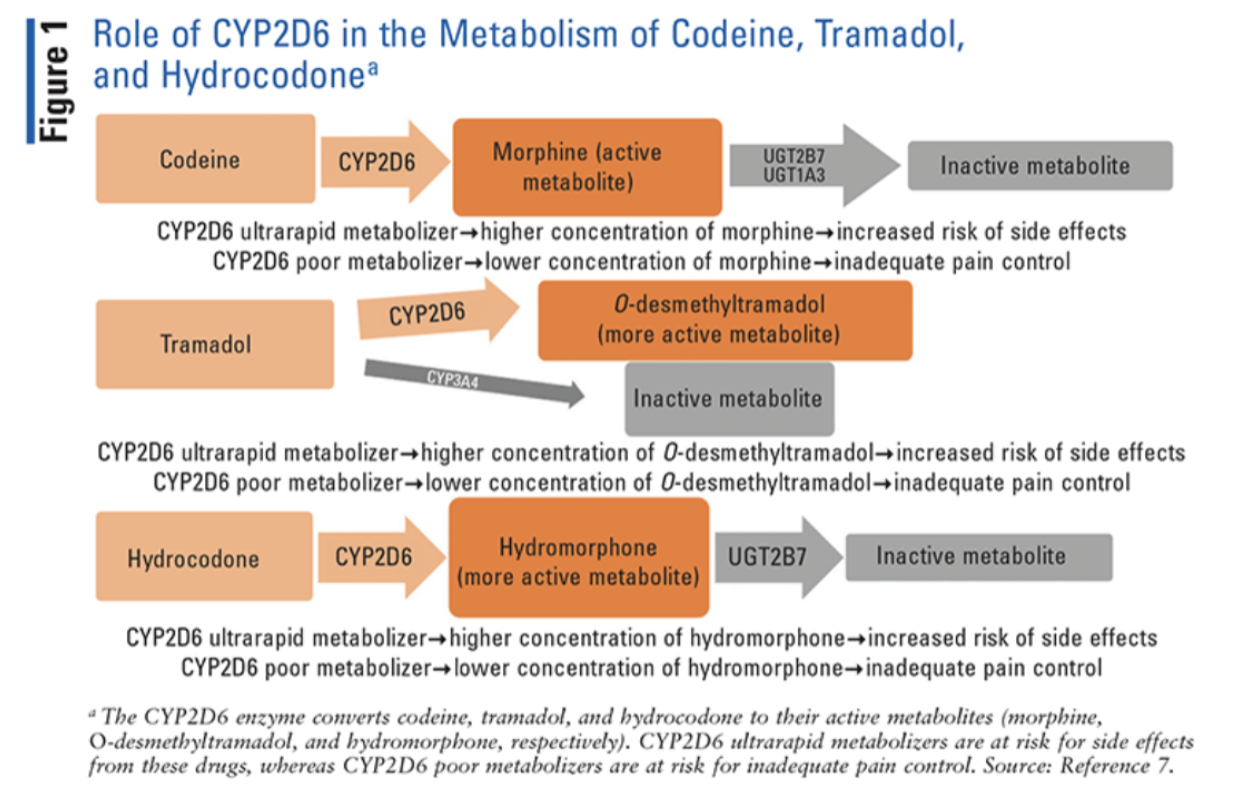 Oxycodone and hydrocodone are also converted by CYP2D6 into oxymorphone and hydromorphone, respectively. Although oxymorphone and hydromorphone have higher morphine equivalents than their parent drugs, both oxycodone and hydrocodone are active drugs. So alterations in their metabolic pathways have a less profound clinical effect than observed with codeine and tramadol.