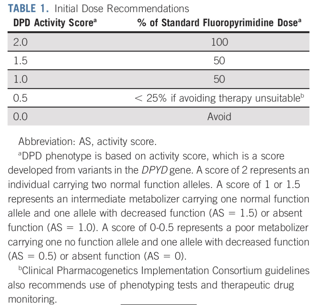 There’s also a somewhat simplified system for assigning a patient a DPYD activity score, which can help to determine how much fluoropyrimidine should be administered: