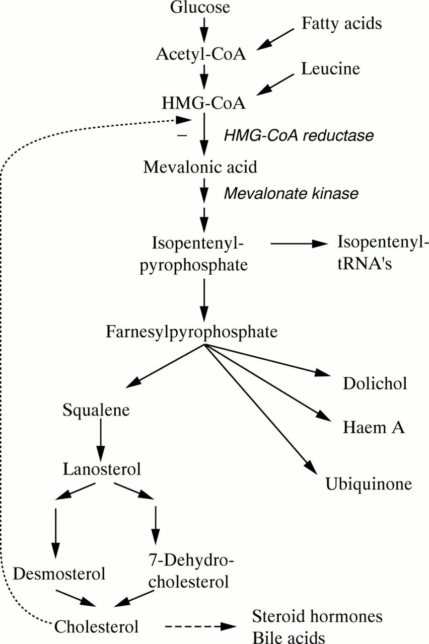 Back to biochem for a moment now. HMG-CoA reductase is the enzyme responsible for a pivotal role - nay, the rate-limiting step - in hepatic cholesterol synthesis. This important step is the conversion of HMG-CoA to mevalonic acid.