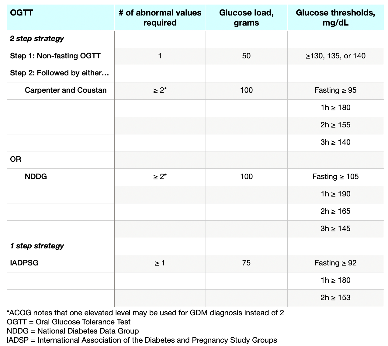 So speaking of inconsistencies in diagnostic criteria and various strategies, check out this table with the tests and thresholds for GDM: