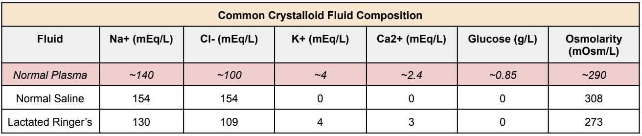 Now again, clinical judgment should be used. In septic patients with a history of CKD and heart failure, you may not need as much fluid repletion. So make sure you always assess each patient before starting fluids. That being said, the two most common IV crystalloid fluids that are used are normal saline and lactated Ringers. What’s the composition difference between the two fluids? Take a look below: