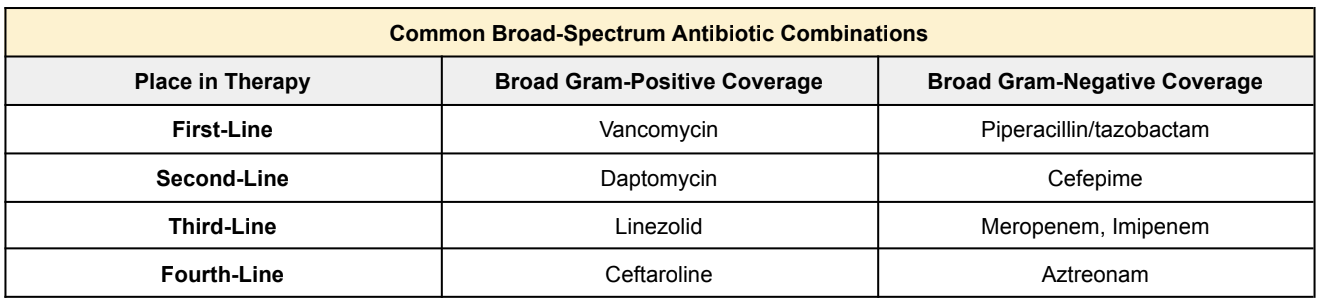 So now that we have an idea of which pathogens to empirically cover for depending on the source of infection, let’s talk about some common broad-spectrum antibiotic agents that are often used in the initial treatment of sepsis.