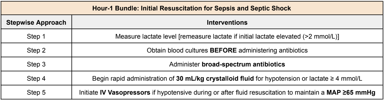 Step 5: Initiate IV vasopressors if hypotensive during or after fluid resuscitation to maintain a MAP ≥65 mmHg