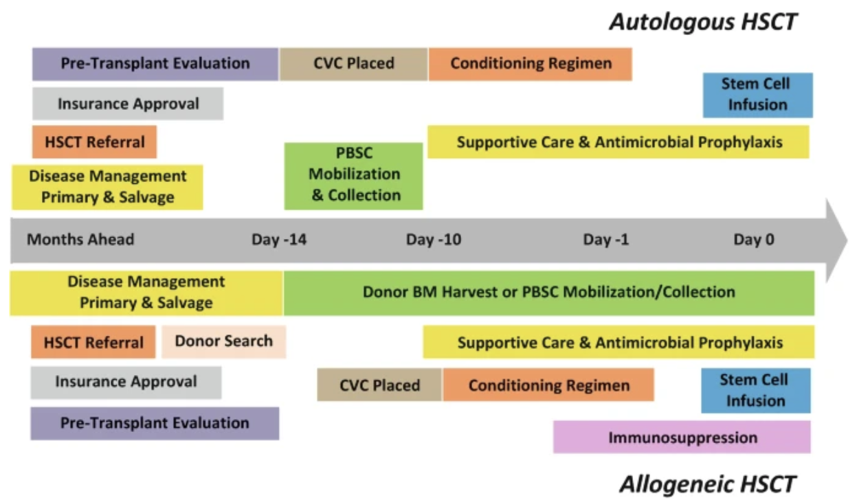 Just take a moment to think about how many people and disciplines are involved in the pre-HSCT process. We’re talking physicians, financial/access staff, stem cell/match/bank specialists, line/access providers, pharmacists, nurses, social workers to prepare patients mentally, etc. It’s also coordinating not one patient’s schedule but TWO, if it’s an allogeneic transplant. This is HUGE. And it’s just the beginning. (Image)
