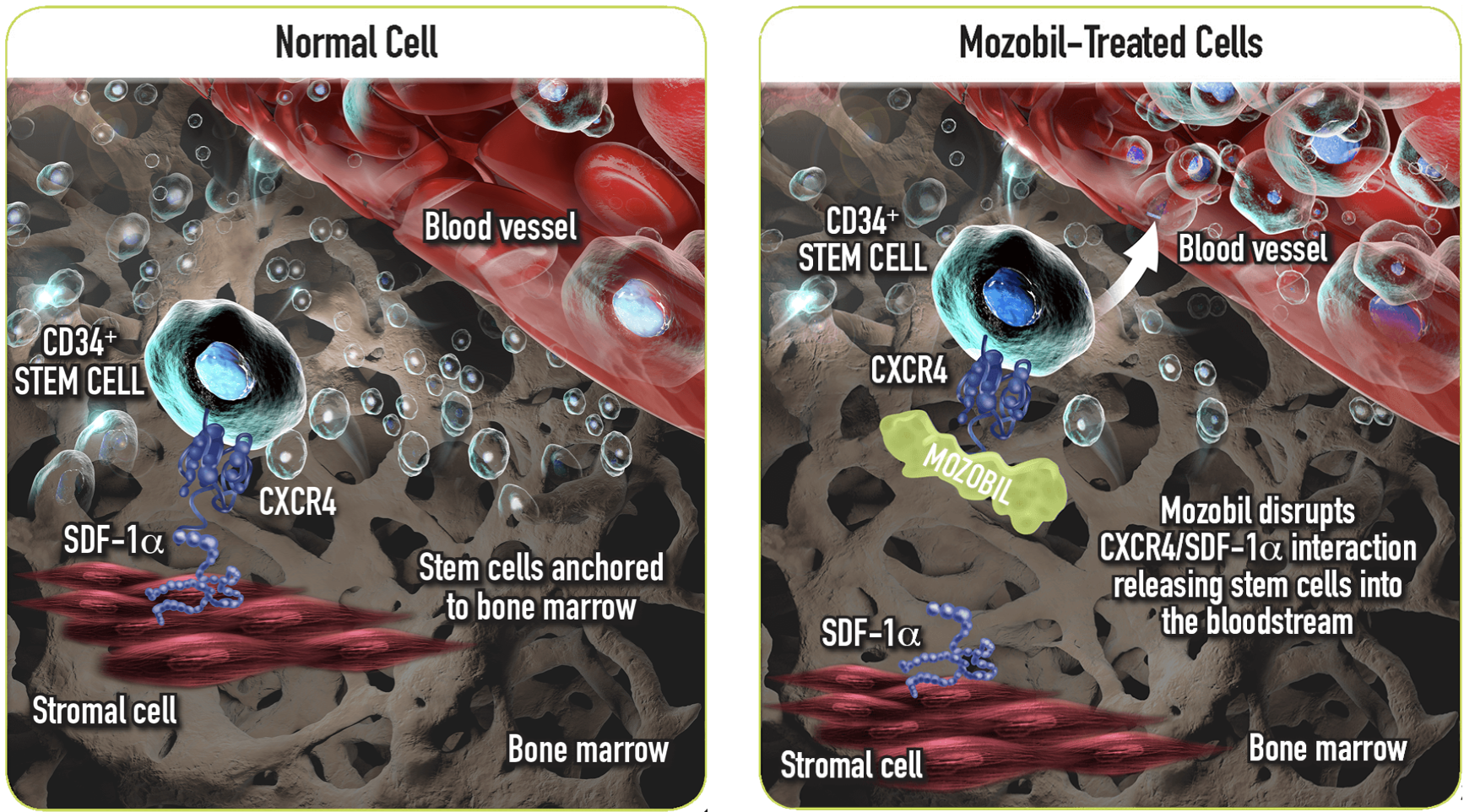 Mozobil = plerixafor. You can think of the CXCR4 and SDF-1a interaction as a tether for the CD34+ stem cell to stay in the bone marrow. Plerixafor interferes with this anchoring mechanism, allowing the stem cell to leave the marrow. Let’s have a moment for the scientific brilliance of the people developing these medications! (Image)