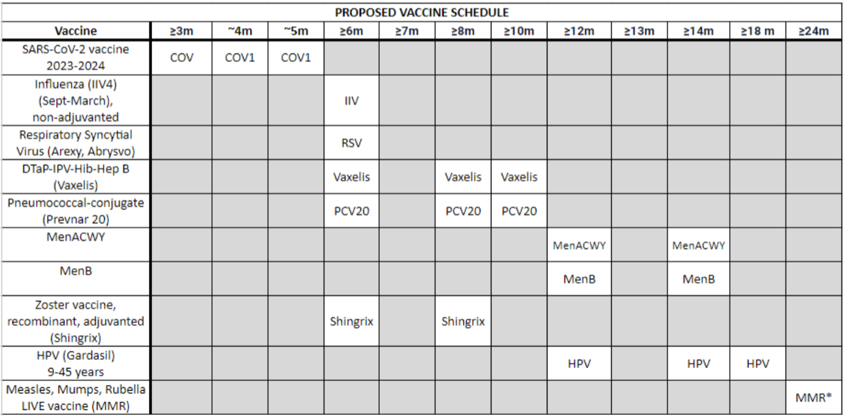 The herpes zoster virus vaccine (Shingrix) is often given at months 6 and 8. The HPV and Hepatitis A vaccines may also be considered for specific patient populations.