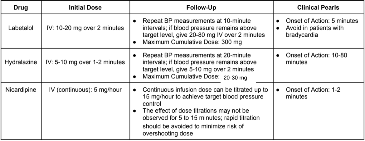 On to our next goal of care, which is achieving adequate blood pressure control. What is our blood pressure goal? The ACOG guidelines recommend a treatment goal of 120-160/80-110 mmHg. Here’s a table that I made that summarizes everything you need to know about achieving adequate blood pressure control in patients with preeclampsia/eclampsia: