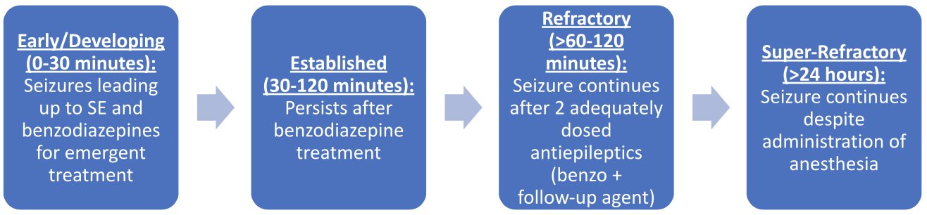 SE can be broken into multiple stages depending on how responsive a patient is to therapy. They are as follows: developing/early-stage, established, refractory, and super-refractory. Benzodiazepines are first-line for initial emergent therapy, with IV AEDs (VPA, levetiracetam, and fosphenytoin) used for established disease, and IV anesthetics (midazolam, propofol, pentobarbital) in refractory cases. Choice of agent may depend on multiple factors including comorbidities, concomitant medications, hemodynamic status, and cost.