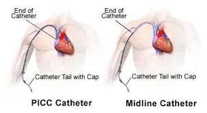 Contrast this with a midline, which ends in a peripheral location (aka a smaller vessel that can not handle total PN). However, peripheral parenteral nutrition (or PPN) may be an option through a midline given its less robust osmolality compared to total PN. (Image)