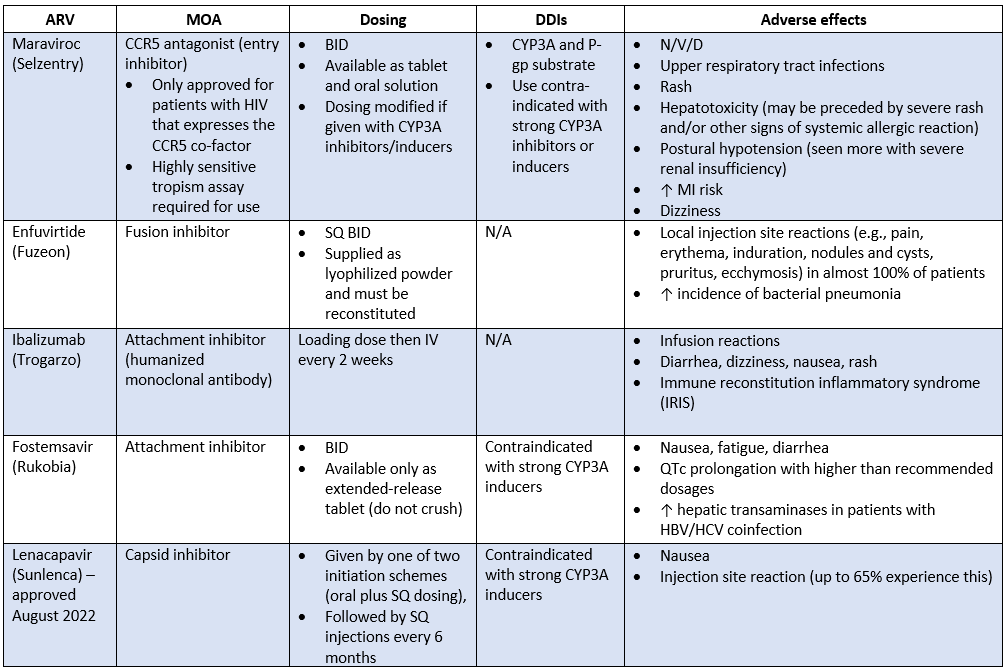 These 3 classes are typically reserved for PLHIV who have exhausted all lines of therapy we’ve discussed prior. Also referred to as the heavily-treatment experienced (HTE) patient.