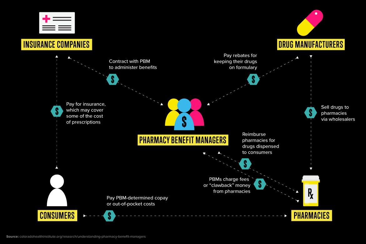 The whole system is riddled with conflicts of interest. Vertical integration allows for patient steering to PBM-owned pharmacies and a “rebate wall” that is often in favor of expensive, high-rebate, brand-name drugs.
