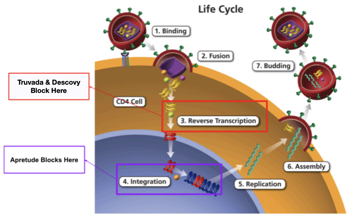 Alright, now let’s talk about that long-acting injectable form. Unlike our oral options, Apretude (cabotegravir) belongs to the integrase inhibitor drug class. Specifically, it inhibits HIV integrase by binding to the integrase active site and blocking the strand transfer step of retroviral DNA integration (step 4 of the HIV replication cycle). If you’re a visual learner like me, here is a picture that shows where these PrEP drugs work in the HIV replication cycle: